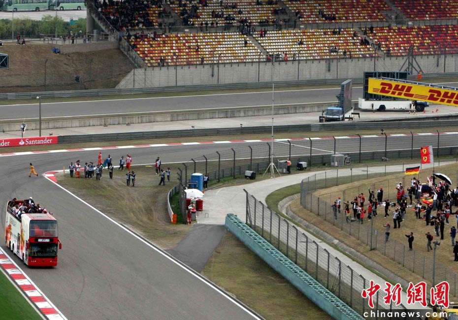 4月18日下午,2010國(guó)際汽聯(lián)F1世界錦標(biāo)賽上海站在上海國(guó)際賽車場(chǎng)舉行正式比賽,賽前24名參賽車手按照慣例乘坐敞篷車環(huán)繞賽場(chǎng)一周與車迷見(jiàn)面,但是寥寥無(wú)幾的觀眾與陰沉的天氣使上海F1賽事創(chuàng)下開(kāi)賽七年以來(lái)觀眾人數(shù)最低的紀(jì)錄。中新社記者 任晨鳴 攝