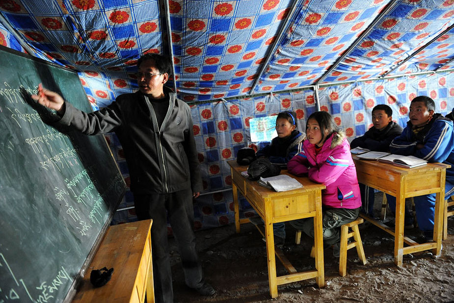4月18日,70多名孩子在地震四天后重新走進(jìn)了課堂,玉樹州孤兒學(xué)校成為了地震災(zāi)區(qū)第一所復(fù)課的學(xué)校,剛完成帳篷搭建的青海省玉樹藏族自治州第一民族中學(xué)3個年級的學(xué)生也開始復(fù)課。圖為4月18日,玉樹藏族自治州第一民族中學(xué)八年級老師次成尼瑪(左一)在帳篷教室內(nèi)給學(xué)生上課。 圖片來源:新華網(wǎng)