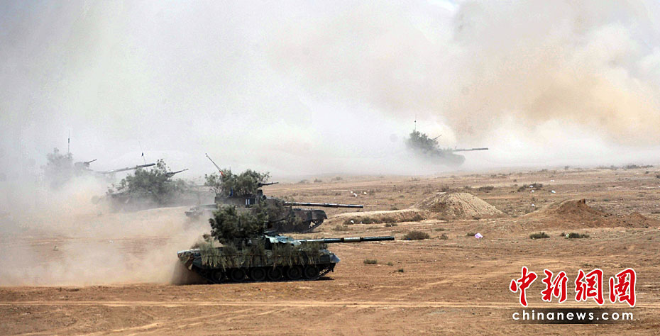 巴基斯坦軍隊(duì)4月18日出動(dòng)戰(zhàn)機(jī)、坦克和重型火炮,在靠近印度邊界的東部沙漠地區(qū)舉行“新決心—3”軍事演習(xí)。圖片來源:中國新聞網(wǎng)