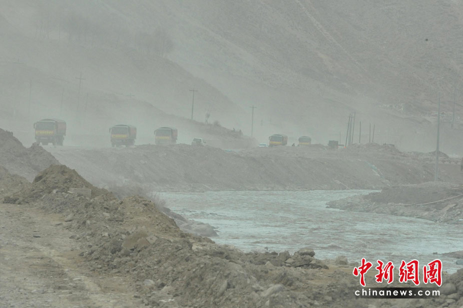 4月中旬青海玉樹(shù)地震災(zāi)區(qū)風(fēng)沙迷漫,中國(guó)各地軍民車(chē)隊(duì)在風(fēng)塵滾滾中馳援青藏高原偏僻一角的玉樹(shù),艱難開(kāi)通抗震救災(zāi)大通道。中新社發(fā) 賈國(guó)榮 攝
