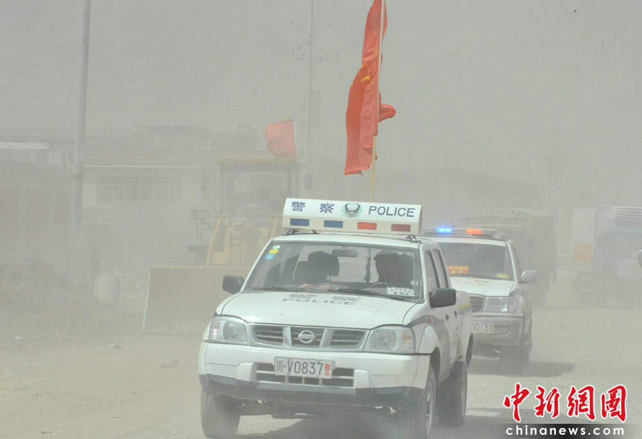 4月中旬青海玉樹地震災(zāi)區(qū)風(fēng)沙迷漫,警車在結(jié)古鎮(zhèn)災(zāi)區(qū)風(fēng)煙滾滾中艱難穿行。中新社發(fā) 賈國榮 攝