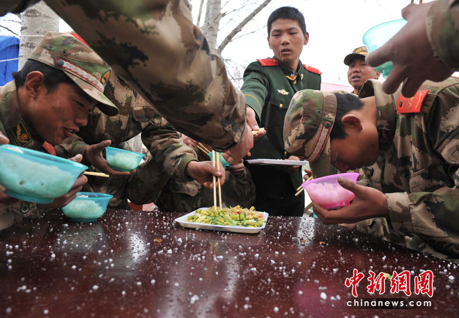 4月20日中午時分,玉樹地震災區(qū)突然雷雹交加,正在現場救援的青海武警總隊官兵只能在冰雹中吃午餐。中新社發(fā) 賈國榮 攝