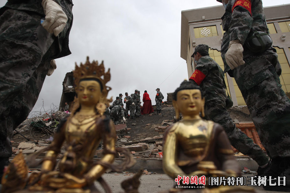 4月17日,青海玉樹結(jié)古鎮(zhèn)民主路,解放軍救援隊為受災(zāi)民眾從房屋廢墟內(nèi)搜索出多件法器。中新社發(fā) 盛佳鵬 攝