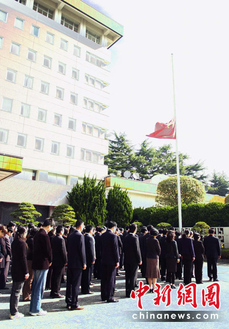 4月21日,按照中國國務(wù)院決定,舉行全國哀悼活動,全國和駐外使領(lǐng)館下半旗志哀,停止公共娛樂活動。圖為中國駐日本大使館集結(jié)全館館員,進(jìn)行降半旗默哀紀(jì)念活動。中新社發(fā) 孫冉 攝