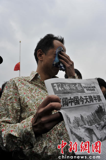 4月21日,為表達(dá)全國(guó)各族人民對(duì)青海玉樹地震遇難同胞的深切哀悼,中國(guó)國(guó)務(wù)院決定,舉行全國(guó)哀悼活動(dòng),全國(guó)和駐外使領(lǐng)館下半旗志哀,停止公共娛樂活動(dòng)。圖為北京天安門廣場(chǎng)上哀悼遇難者的民眾。中新網(wǎng)記者 金碩 攝