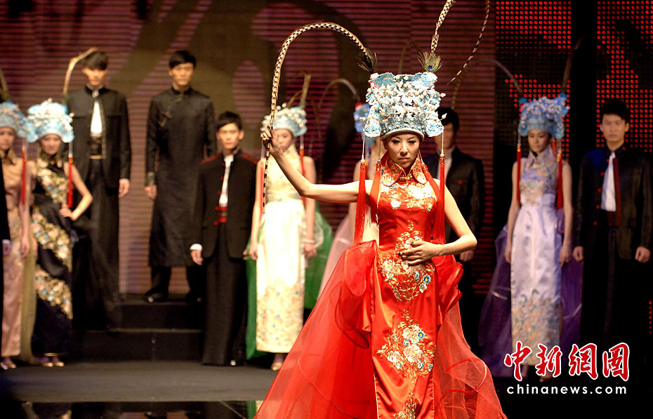 4月20日晚,首屆海西國際時裝周在福建石獅閉幕,本屆時裝周吸引了來自海峽兩岸的紡織服裝界企業(yè)家和知名服裝設(shè)計師。期間舉辦了12場時裝品牌和設(shè)計師作品動態(tài)發(fā)布會。圖為模特展示古今潮流結(jié)合的服裝。王東明 攝