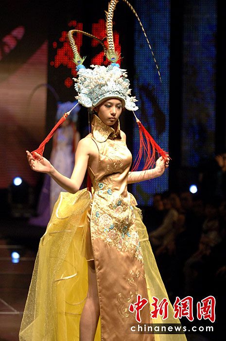 4月20日晚,首屆海西國際時裝周在福建石獅閉幕,本屆時裝周吸引了來自海峽兩岸的紡織服裝界企業(yè)家和知名服裝設(shè)計師。期間舉辦了12場時裝品牌和設(shè)計師作品動態(tài)發(fā)布會。圖為模特展示古今潮流結(jié)合的服裝。王東明 攝