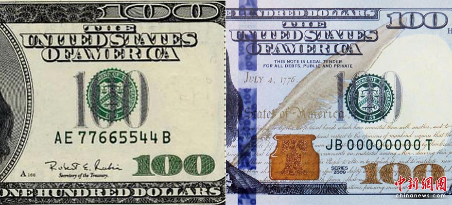 圖為新(右)舊款百元美鈔對比。
