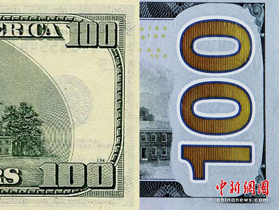 圖為新(右)舊款百元美鈔對(duì)比。