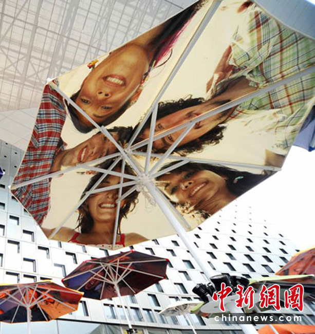 2010年4月22日,上海世博會主題館門前的觀眾等候區(qū),豎立著一把把遮陽的花傘,每一把花傘上都印著四方友人的燦爛微笑。世博園區(qū)為了應對大量客流,園區(qū)設置了大量遮陽和避雨設施,遮陽避雨面積總量達40萬平方米。楊毅 攝