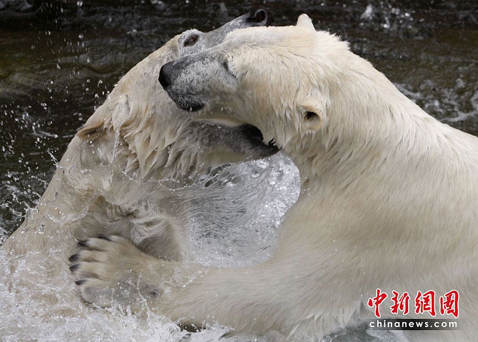 4月23日,德國(guó)紐倫堡動(dòng)物園內(nèi),兩頭北極熊在公園內(nèi)的水池中盡情玩耍,享受春天的陽光。圖片來源:中國(guó)新聞網(wǎng)