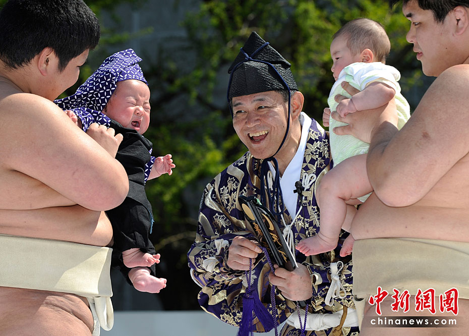4月25日,日本東京,幾名相撲手手抱嬰兒,正努力使嬰兒哭泣。當(dāng)日,一年一度的日本一周歲以下嬰兒啼哭大賽在東京淺草寺舉行。第一個(gè)讓嬰兒哭泣的選手將贏得比賽,日本通過(guò)此種比賽為孩子的健康祈福,他們認(rèn)為嬰兒哭泣將對(duì)他們將來(lái)的身體健康有利。圖片來(lái)源:中國(guó)新聞網(wǎng)