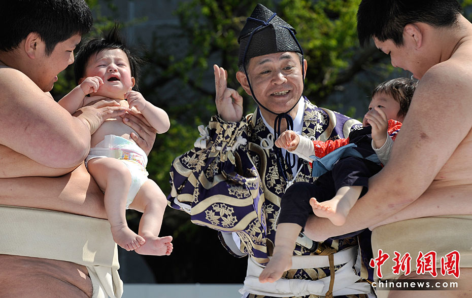 4月25日,日本東京,幾名相撲手手抱嬰兒,正努力使嬰兒哭泣。當(dāng)日,一年一度的日本一周歲以下嬰兒啼哭大賽在東京淺草寺舉行。第一個(gè)讓嬰兒哭泣的選手將贏得比賽,日本通過此種比賽為孩子的健康祈福,他們認(rèn)為嬰兒哭泣將對他們將來的身體健康有利。圖片來源:中國新聞網(wǎng)