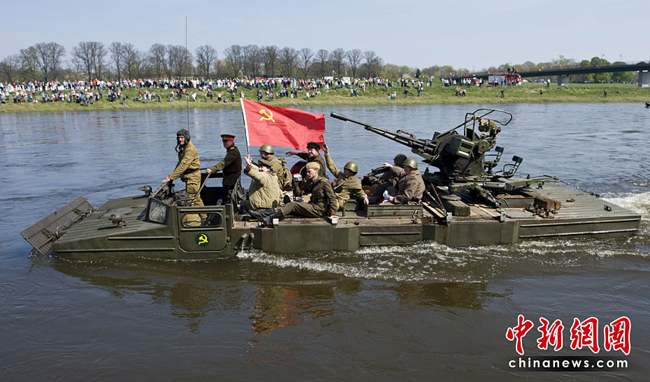 德國當地時間4月24日,演員身著二戰(zhàn)時期美蘇軍裝在德國托爾高南部易北河畔的一座小橋上重現當年的“會師”一幕。