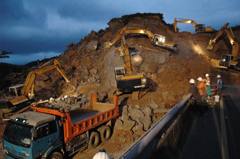 4月25日, 臺灣一條交通要道、“北二高”基隆段發(fā)生山崩意外,傾瀉而下的土石壓垮一座高架橋,并覆蓋道路約200米,據(jù)傳有人車被埋。圖為工程人員連夜開挖,展開大搜救(圖片來源:“中央社”)。