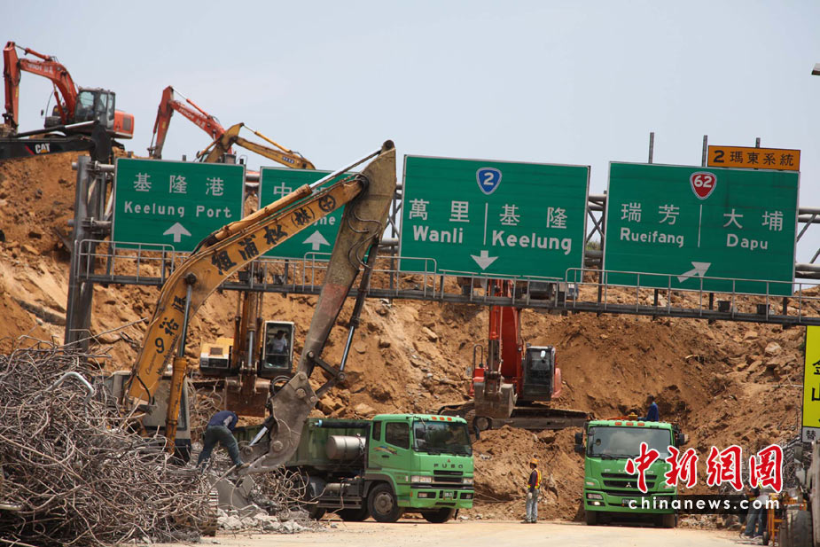 4月26日,臺(tái)灣“北二高”基隆段山崩斷橋意外第2天,大批工程人員使用近50臺(tái)怪手持續(xù)開(kāi)挖,但尚未尋獲被埋的車輛和失蹤者。這起“走山”斷橋意外發(fā)生在25日,一座高百米的山坡全然崩坍,土石覆蓋道路長(zhǎng)約200米、面積達(dá)3個(gè)足球場(chǎng)之大,令南下北上的交通大受影響。 董會(huì)峰 攝