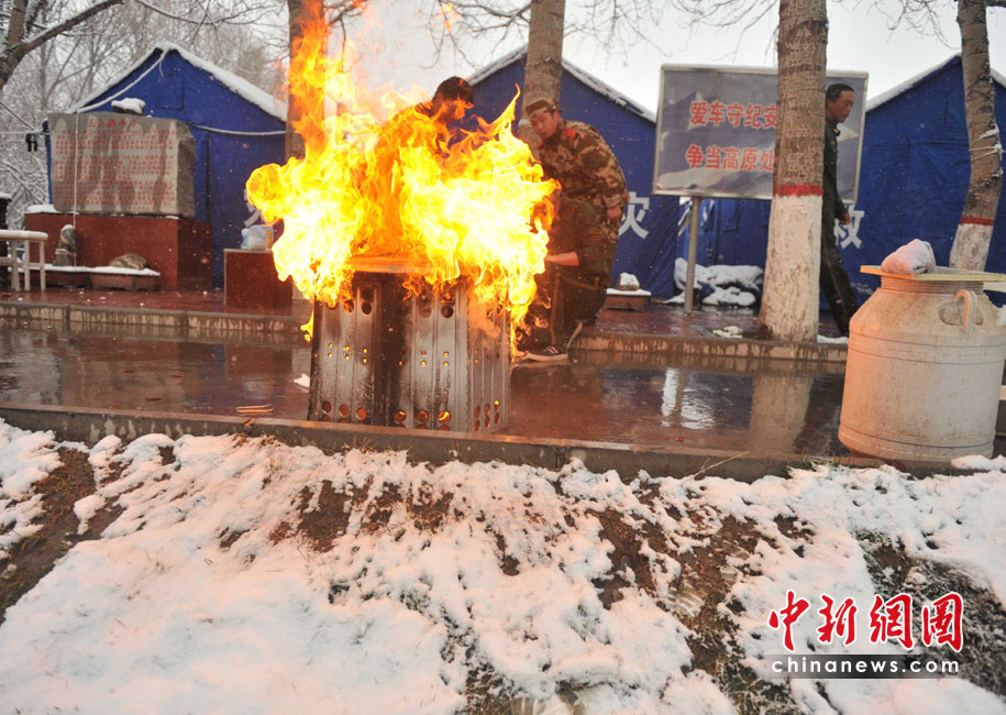 武警青?傟犛駱渲ш犑亲钕韧度肟拐鹁葹牡南蠕h部隊,地震發(fā)生時恰逢部隊出操,營房嚴重受損而官兵平安無恙。這里立即成為抗震救災的軍民和媒體的大本營之一,醫(yī)療救護隊和新型炊事車晝夜為軍民服務。集結在地震災區(qū)的各路部隊從4月低之前全面轉入安置群眾和災后重建,這里的的后勤已經(jīng)得到基本保障。 圖為武警新型炊事車利用氣化爐冒著雨雪為救援官兵和受災民眾做飯。 中新社記者 賈國榮 攝