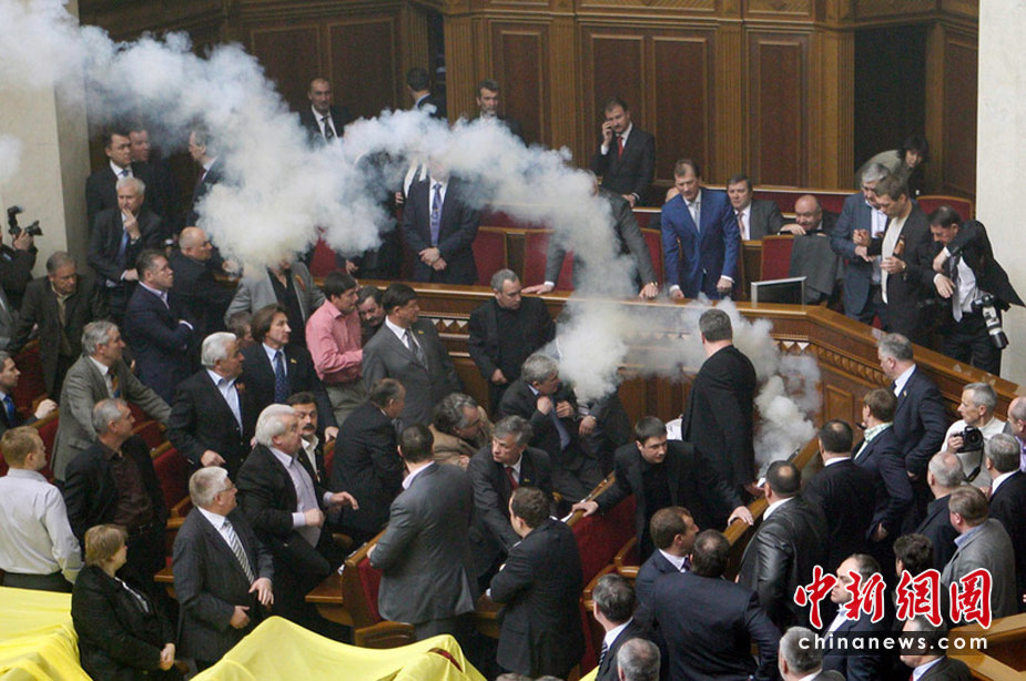 4月27日,基輔,烏克蘭議會就俄羅斯黑海艦隊駐扎問題進行討論時出現(xiàn)混亂,數(shù)千人在議會外示威,會場內(nèi)有人投擲煙霧彈和雞蛋,大廳內(nèi)煙霧彌漫,場面一度混亂。
