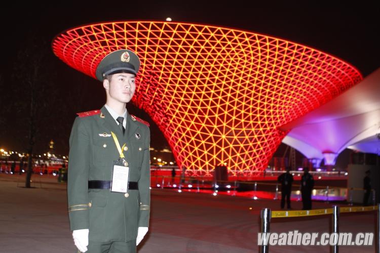 2010年4月27日,上海世博會開幕式彩排順利進行。圖為世博彩排現場堅守崗位的武警戰(zhàn)士。卞赟 攝(圖片來源:中國天氣網)