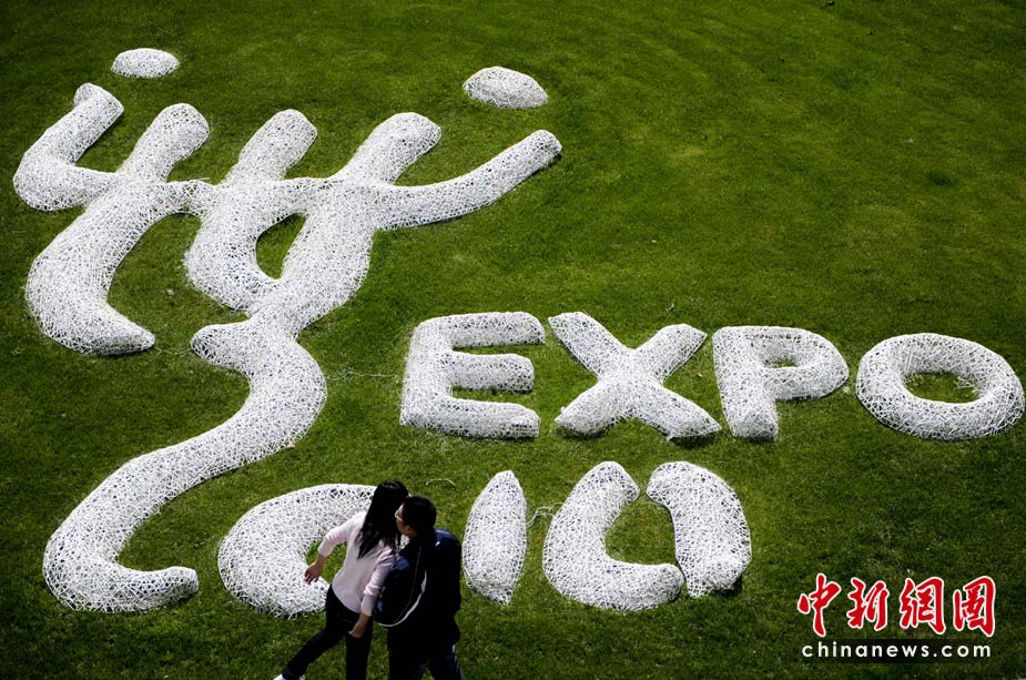 4月29日,上海靜安區(qū)草坪上的世博會(huì)會(huì)徽和一對情侶。世博會(huì)開幕前,面臨“大考”的上海充滿喜慶氣氛。 中新社發(fā) 廖攀 攝