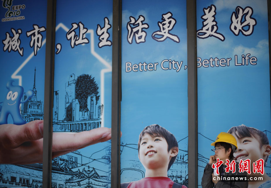 4月29日,上海一名建筑工人站在世博會(huì)宣傳海報(bào)前。世博會(huì)開(kāi)幕在即,面臨“大考”的上海充滿(mǎn)喜慶氣氛。中新社發(fā) 盛佳鵬 攝