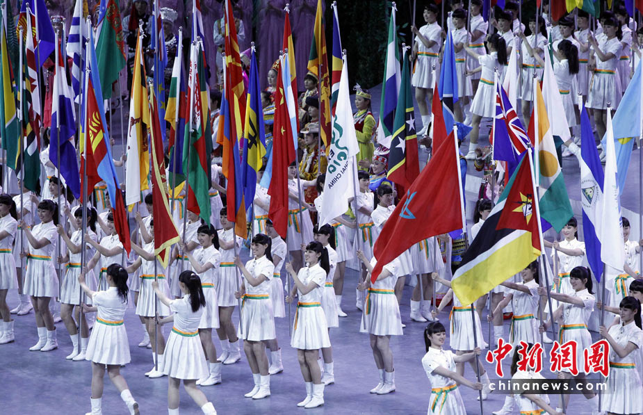 4月30日,中國(guó)2010年上海世博會(huì)開(kāi)幕式在上海世博園世博文化中心舉行。圖為參展方旗幟方隊(duì)入場(chǎng)。中新社發(fā) 湯彥俊 攝