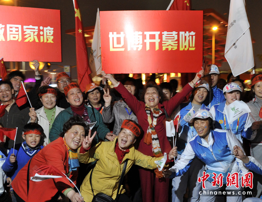 30日晚上8時,2010年上海世博會正式拉開帷幕。上海周家渡動遷居民和志愿者在中國館前打出“世博開幕啦”的大牌子,高喊:“世博開幕啦!我們開心死啦!”中新網(wǎng)記者 王紅綱 攝