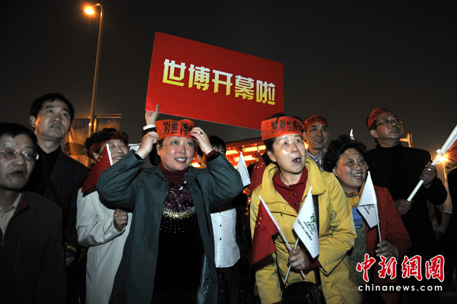 30日晚上8時(shí),2010年上海世博會(huì)正式拉開(kāi)帷幕。上海周家渡動(dòng)遷居民和志愿者在中國(guó)館前打出“世博開(kāi)幕啦”的大牌子,高喊:“世博開(kāi)幕啦!我們開(kāi)心死啦!”中新網(wǎng)記者 王紅綱 攝