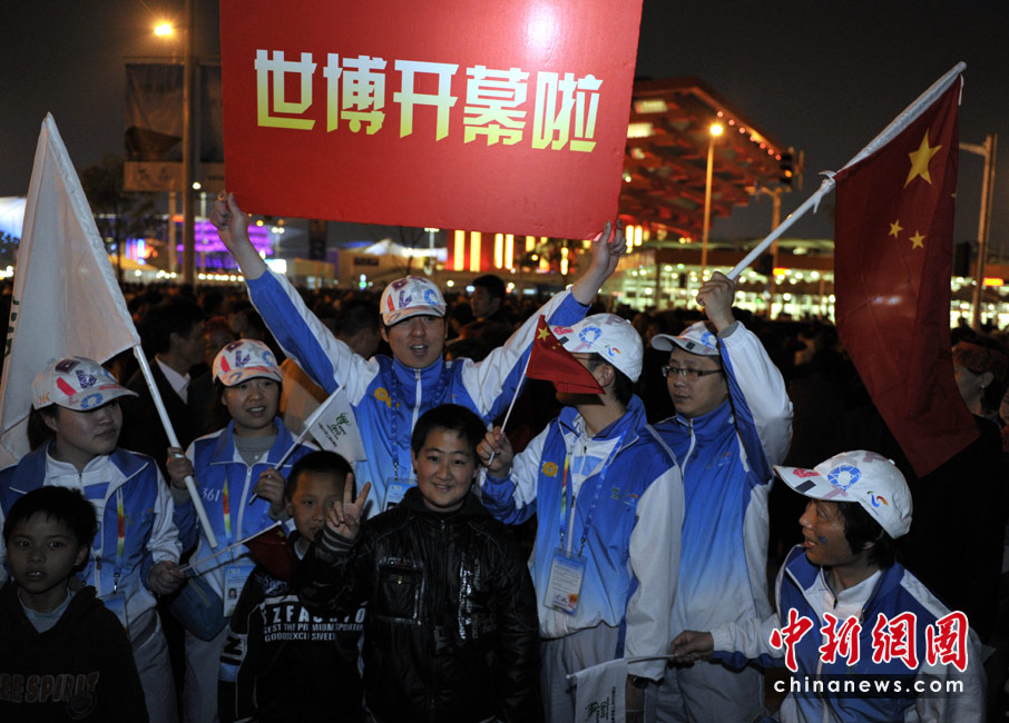 30日晚上8時,2010年上海世博會正式拉開帷幕。上海周家渡動遷居民和志愿者在中國館前打出“世博開幕啦”的大牌子,高喊:“世博開幕啦!我們開心死啦!”中新網記者 王紅綱 攝