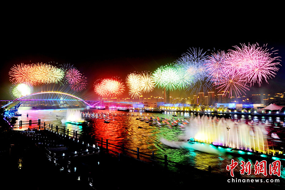 4月30日晚21時28分,在世博會焰火燈光表演開始。萬千煙花爭奇斗妍,黃浦江兩岸綿延3.28公里同時奏響火樹銀花不夜天的華彩世博樂章。圖片來源:中國新聞網