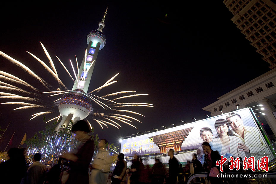4月30日晚,2010年上海世博會開幕式在上海世博園世博文化中心舉行。21時28分,世博會焰火燈光表演開始。黃浦江兩岸綿延3.28公里同時奏響火樹銀花不夜天的華彩世博樂章。圖片來源:中國新聞網(wǎng)