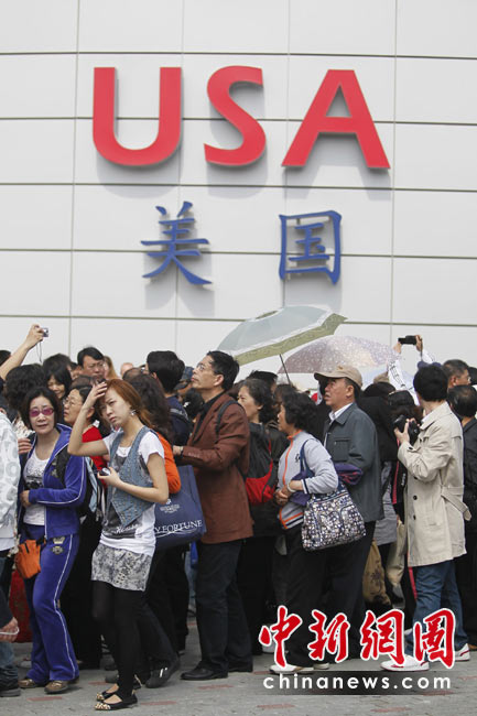 5月1日,上海世博會(huì)正式開(kāi)園迎客,首批游客入園參觀。圖為在美國(guó)館外排隊(duì)的游客。