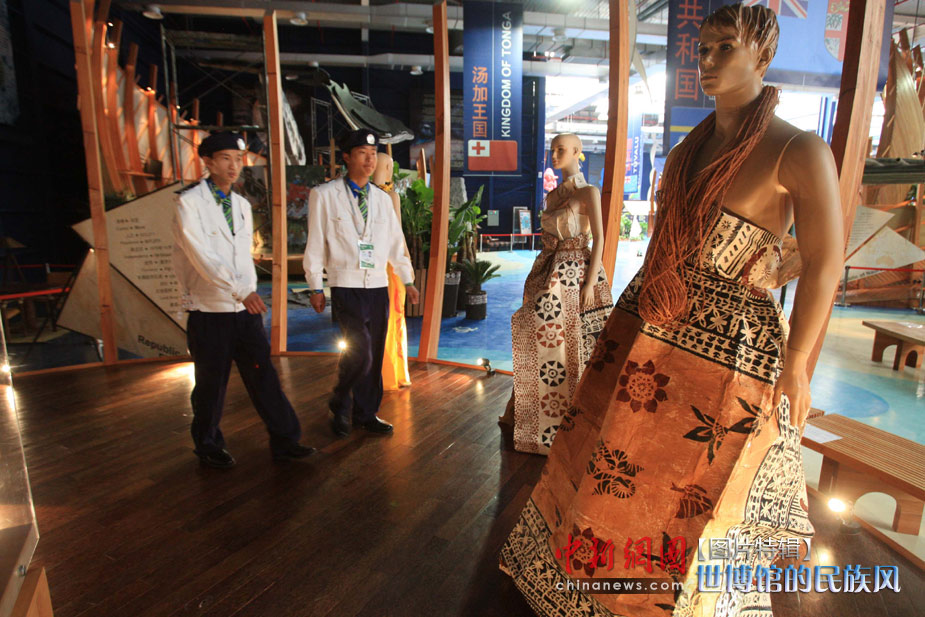 5月1日,上海世博會開園第一天,斐濟國的手繪樹皮時裝在太平洋聯(lián)合館展出。中新社發(fā) 潘索菲 攝