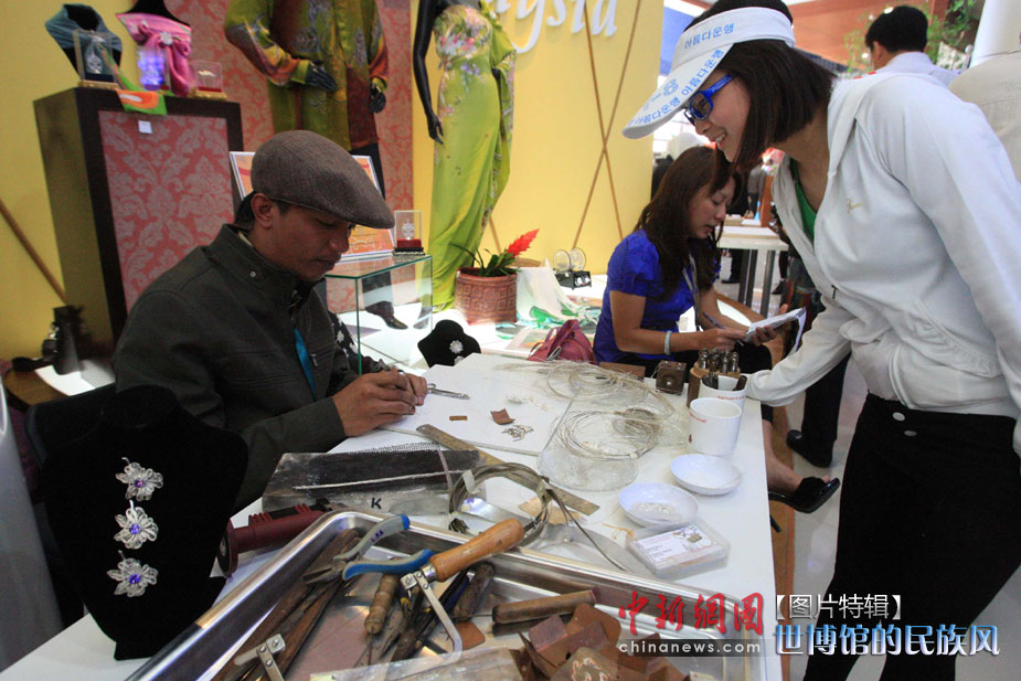 5月1日,上海世博會馬來西亞館開館,手工藝人用金銀絲打造漂亮的胸針,讓參觀者驚訝不已。中新社發(fā) 潘索菲 攝。