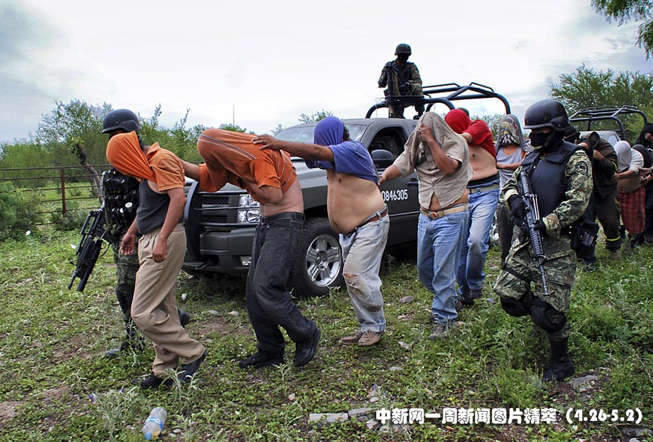 27日(周二),墨西哥軍隊看守著一批涉嫌綁架人質的毒販。