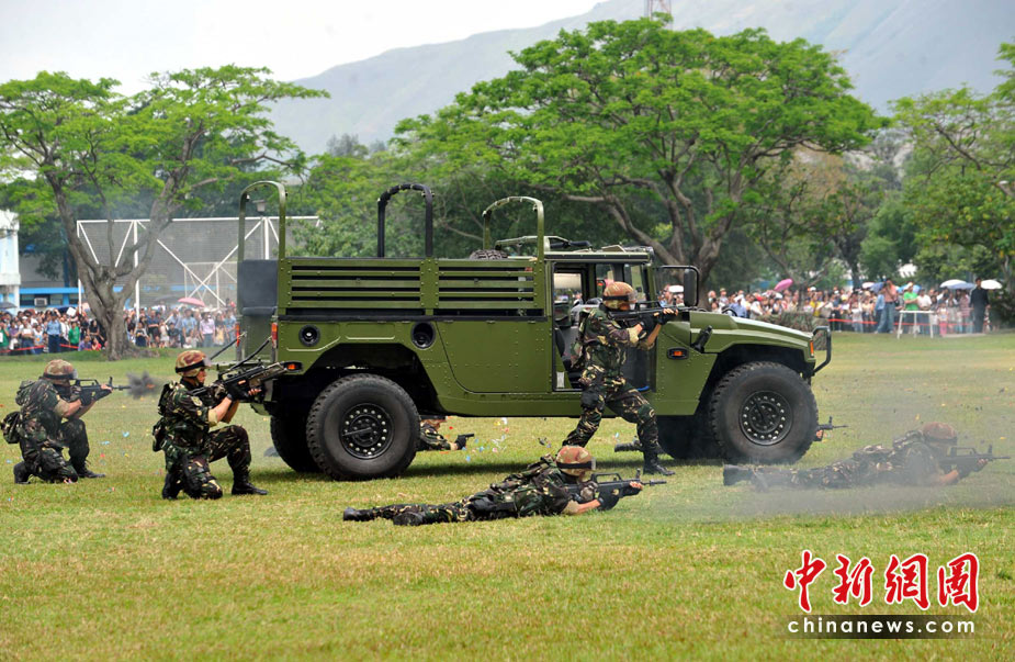 為慶!拔逡弧眹H勞動節(jié),進一步增進與香港社會各界相互溝通與交流,中國人民解放軍駐香港部隊5月2日開放了石崗軍營。圖為駐港部隊“獵人戰(zhàn)斗”表演。 中新社發(fā) 鄧慶樂 攝