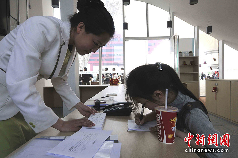 5月2日清晨,7歲的林姝彤小朋友剛跟著伯伯?huà)饗疬M(jìn)入上海世博園,就在亂哄哄的人流中走丟了,志愿者把她領(lǐng)到走失兒童認(rèn)領(lǐng)處。服務(wù)小姐在詢問(wèn)她的姓名等關(guān)鍵詞之后,會(huì)立即廣播尋人啟示。結(jié)果,她很快就和親人團(tuán)圓了。中新社記者 賈國(guó)榮 攝