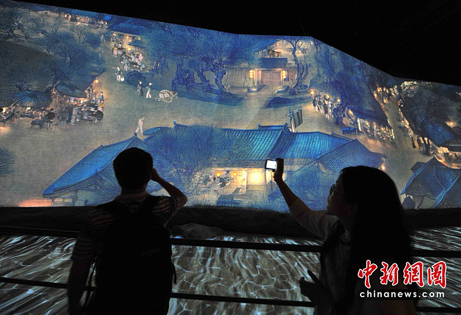 5月2日,中外觀眾依然最熱捧上海世博會中國館的“鎮(zhèn)館之寶”——巨幅放大電子動(dòng)態(tài)版的北宋畫家張擇端名作《清明上河圖》。此世博版的《清明上河圖》高6.3米,長130余米,約是原圖的30倍,需要12臺電影級的投影儀同時(shí)工作。整個(gè)活動(dòng)畫面以4分鐘為一個(gè)周期,盡展宋朝盛世的都市日夜風(fēng)情。中新社記者 賈國榮 攝
