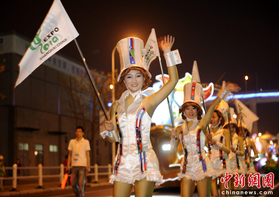 5月2日晚,由一輛輛充滿異域風(fēng)情的花車和身著盛裝的表演者組成的“歡樂盛裝大巡游”在世博園區(qū)舉行。中新網(wǎng)記者 王紅綱 攝