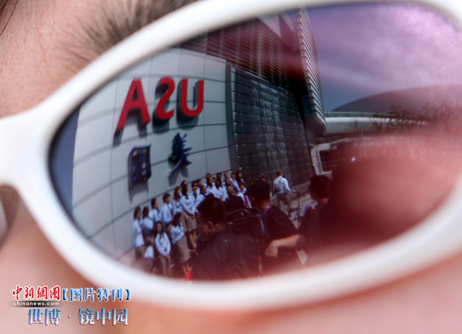 世博園開(kāi)園3天,天氣一直晴熱,不少游客帶起墨鏡來(lái)遮擋刺目的陽(yáng)光,從鏡片的折射中看世博園,別有一番趣味。中新社記者 湯彥俊攝