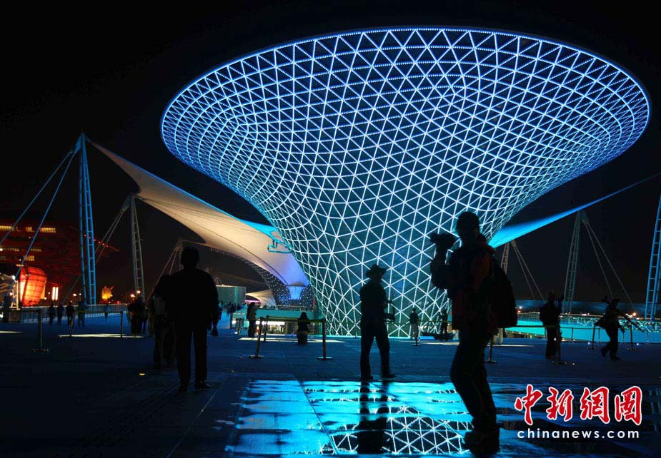 夜幕下的上海世博園區(qū)處處流露光華與璀璨,世博軸上的“陽光谷”成為一個個流光溢彩的“夜光杯”,以不同色調(diào)交織成流動的光影旋律,給游客們帶來難以忘懷的感受。中新社發(fā) 宗金柱 攝