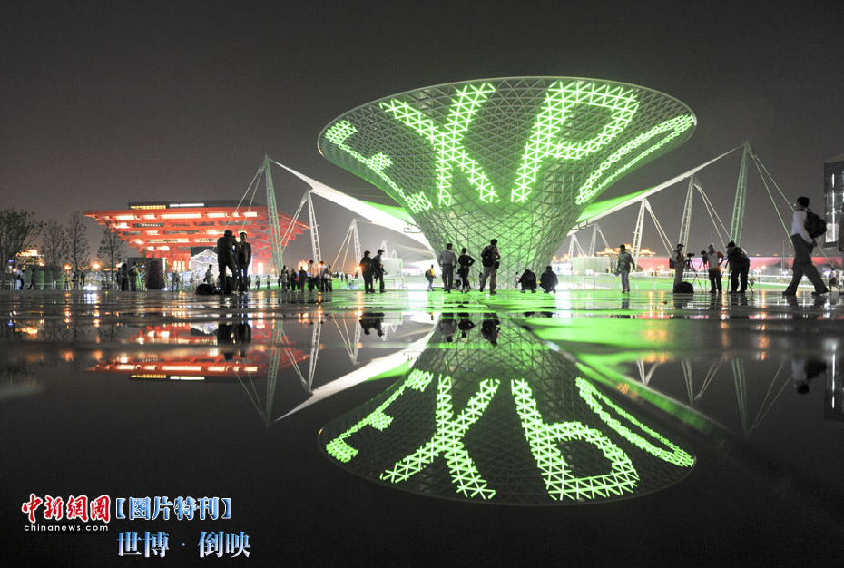 世博園慶典廣場上,積水倒映著美麗的世博軸。中新社記者 廖攀 攝
