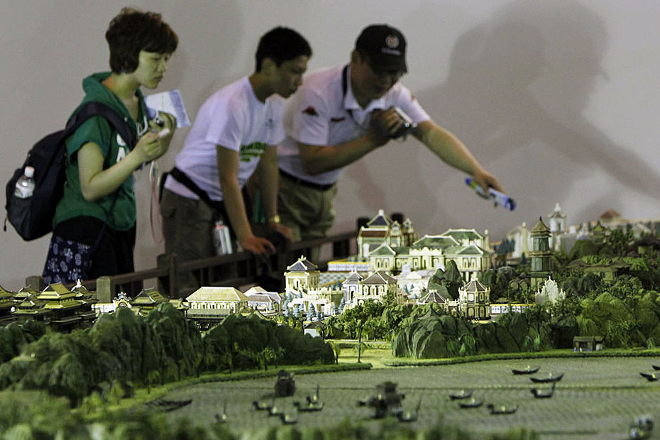 5月4日,游客在參觀縮微版“圓明園”。近日,一座“全景式巨型立雕圓明園”在上海世博會(huì)世界貿(mào)易中心協(xié)會(huì)館亮相。這座縮微版的“圓明園”以1比150的比例制作而成,再現(xiàn)了全盛時(shí)期的圓明園雄偉壯觀的全景。圖片來源:新華網(wǎng) 裴鑫 攝
