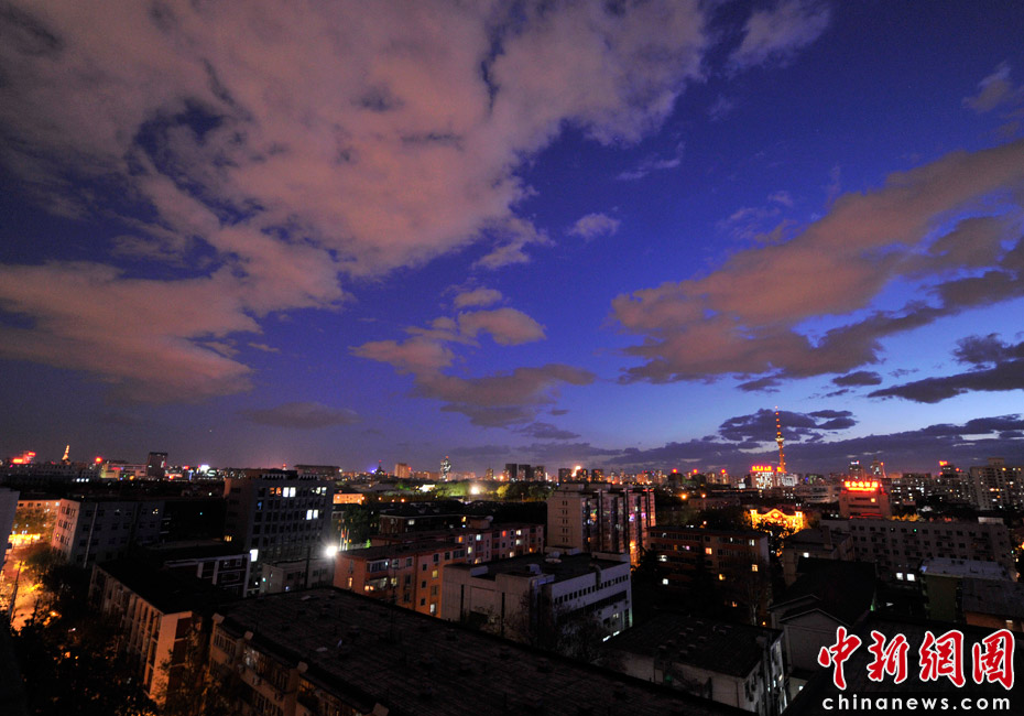 5月5日立夏,京城降雨今晨剛剛結(jié)束,霧氣伺機(jī)又起。傍晚時(shí)分,隨著四級(jí)北風(fēng)的到來,京城天氣逐漸轉(zhuǎn)晴,霧氣慢慢消散天空彤云密布夜色瑰麗。中新網(wǎng)記者 金碩 攝
