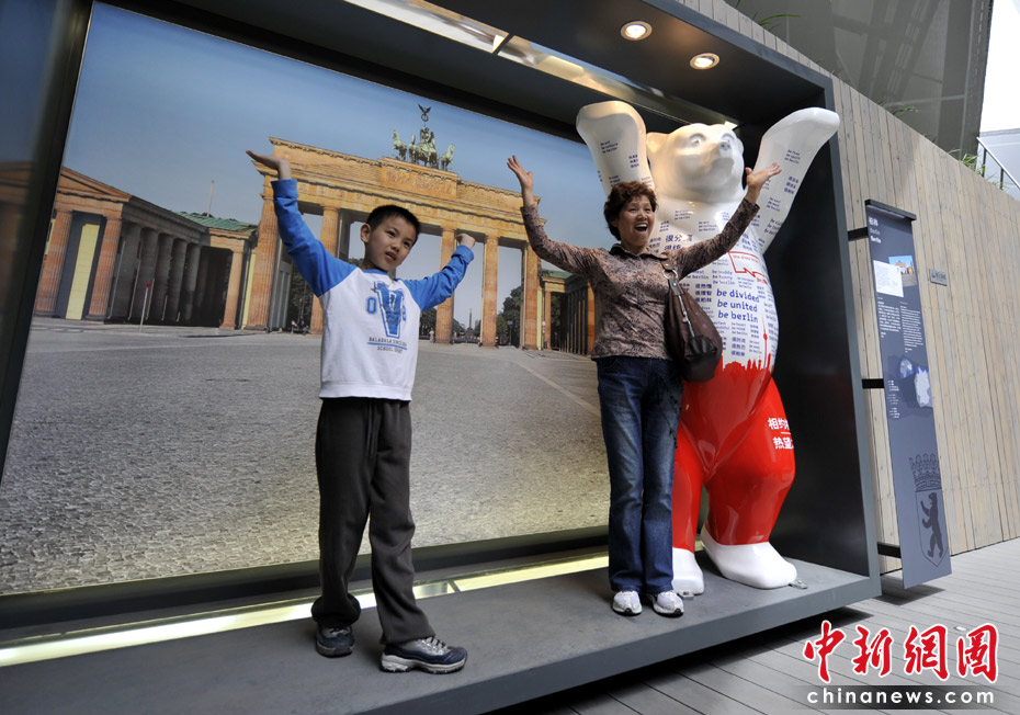 游客在圖片墻前模仿“柏林熊”的樣子拍照。中新網(wǎng)記者 王紅綱 攝