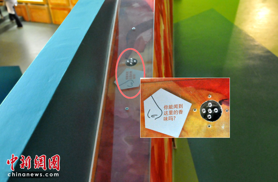 樓梯扶手上也“暗藏玄機(jī)”,這些小孔都是有香味發(fā)出的。中新網(wǎng)記者 王紅綱 攝