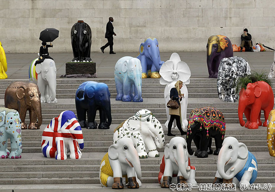 5月4日,2010年倫敦大象游行活動當(dāng)日在特拉法爾加廣場啟動。260個真象大小的彩繪雕塑將在倫敦各處展出,并將于6月30日拍賣為慈善組織籌款。圖片來源:中國新聞網(wǎng)>>點擊觀看詳細內(nèi)容