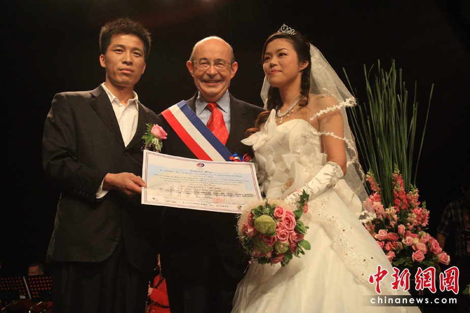 5月11日,35對(duì)新人來(lái)到世博法國(guó)館內(nèi)舉行婚禮儀式。法國(guó)館舉行“法蘭西浪漫婚典”的集體婚禮。圖為法國(guó)圖爾市長(zhǎng)為參與此婚典的新人頒發(fā)“證書”。中新社發(fā) 潘索菲 攝