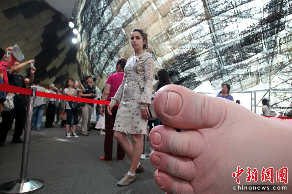 圖為西班牙館內(nèi)游客在巨型寶寶的腳下留影。 中新社記者 蘇丹 攝