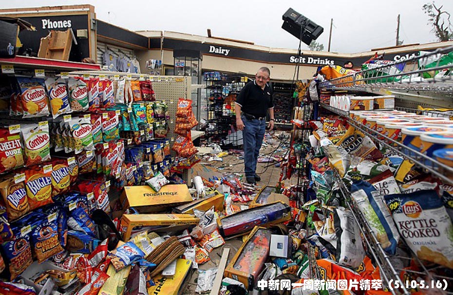周二(11日),在美國俄克拉荷馬市東部的一處卡車休息站,沃倫·華爾滋(Warren Waltz)查看受災(zāi)情況。龍卷風(fēng)周一襲擊了美國南部平原,當(dāng)時汽車被吹離高速公路,房屋被掀翻,目前已有至少五人遇難。